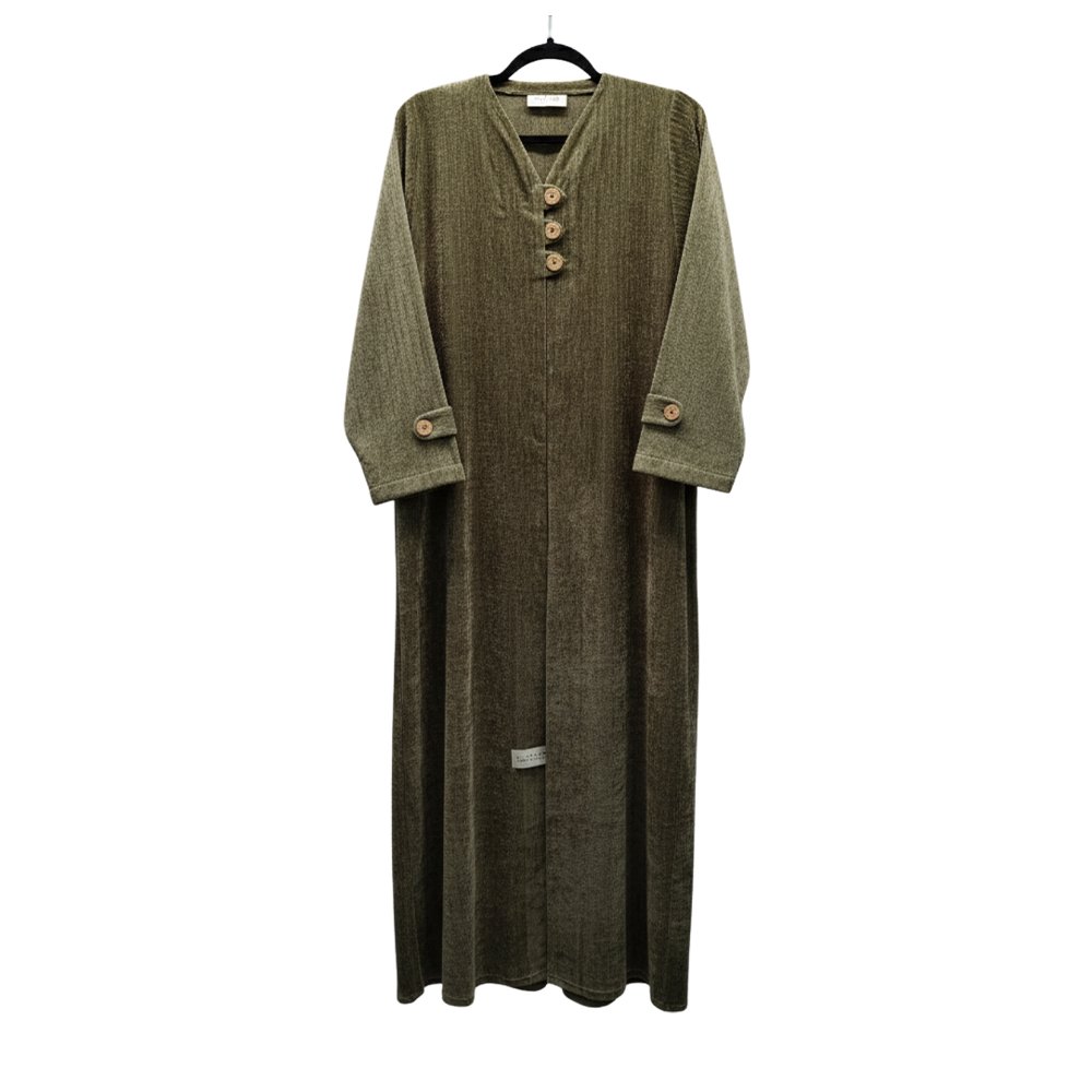 Textured abaya with pearl button details, available in Navy, Deep Purple, Black, Olive, and Midnight Blue.